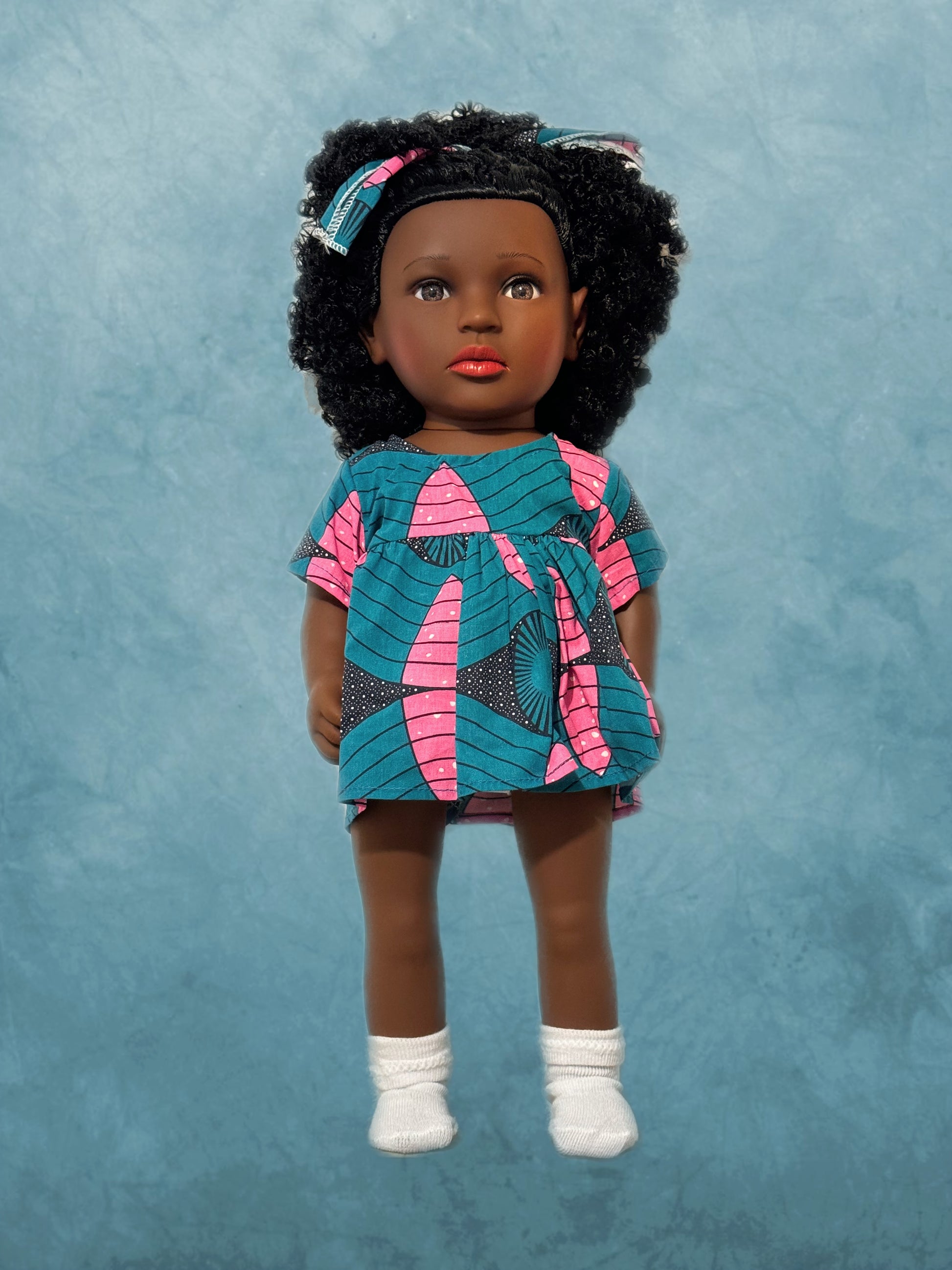 Kaya est accompagnée d'une belle tenue en tissu africain, avec un bandeau assorti placé dans ses jolis cheveux crépus, une petite culotte, deux paires de chaussettes et un petit chouchou ou une brosse à cheveux en cadeau!